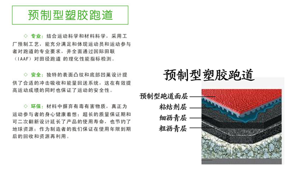 预制塑胶跑道材料是在PU球场材料的基础上开发研制出来的新一代球场材料。该材料是以聚氨酯(PU)材料与含有有机硅成分的材料科学地复合在一起,所生产出来的材料用在球场面层上,从根本上有效地解决了PU球场材料在专业性能、环保施工、使用寿命、日常维护等方面的不足,具有革命性的创新性能,是替代双组份PU的新一代环保产品。